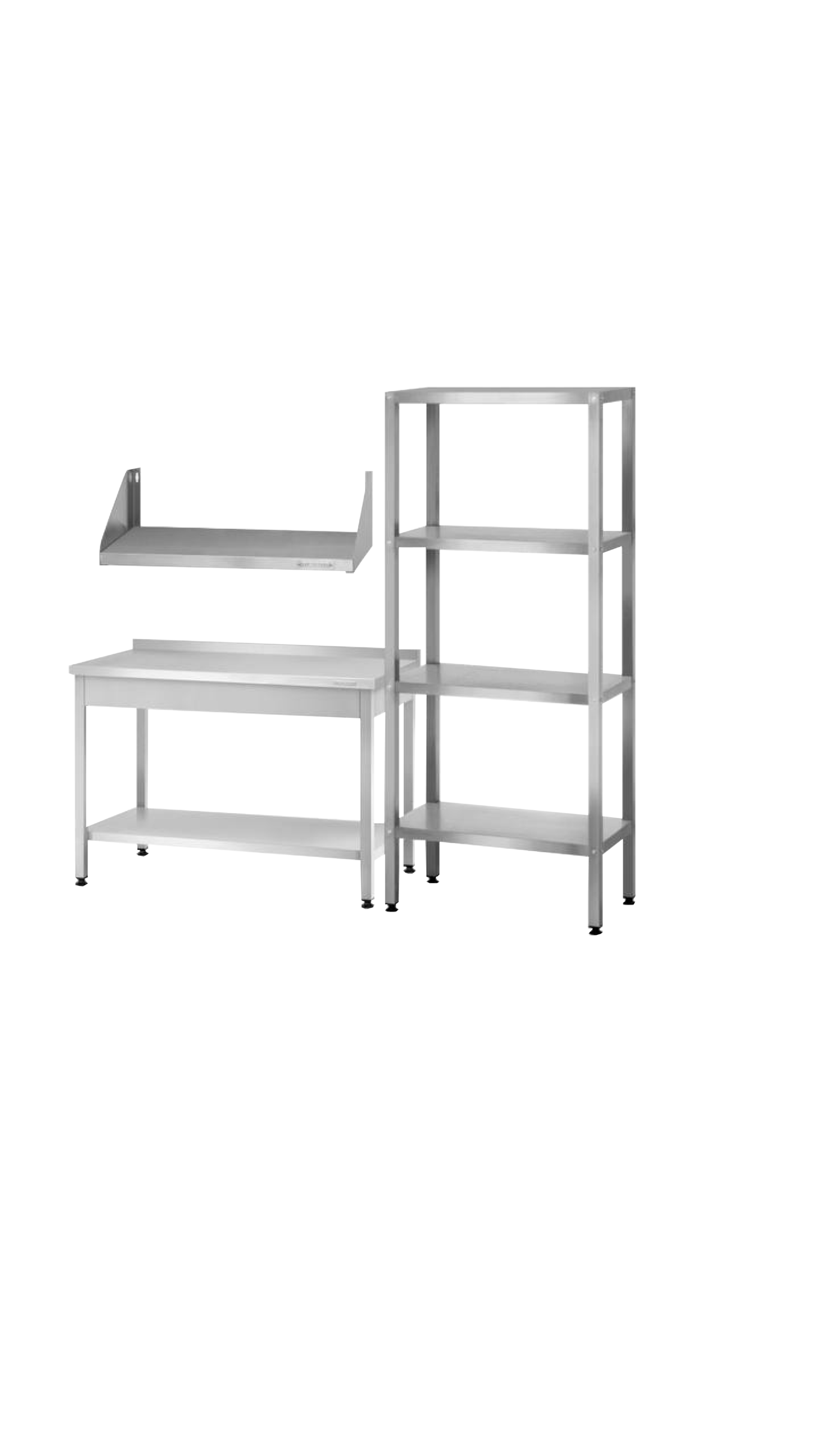 Характеристики: исполнение стоек - угловые катаные с ребрами жесткости; материал полок, стоек - нержавеющая сталь, усиление полок в комплекте; толщина стали полок: ширина 400, 500 мм – 0,5 мм, ширина 600 мм – 0,8 мм; толщина стали стоек - 1,2 мм; шаг перфорации стоек – 50 мм;